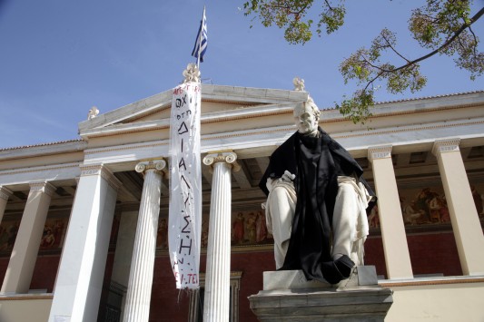 Μαύρη τήβεννο φόρεσαν διαμαρτυρόμενοι στο άγαλμα του Αδαμάντιου Κοραή, ενώ κρέμασαν και πανό στα Προπύλαια του Πανεπιστημίου Αθηνών κατά του μέτρου της διαθεσιμότητας στα πανεπιστήμια.