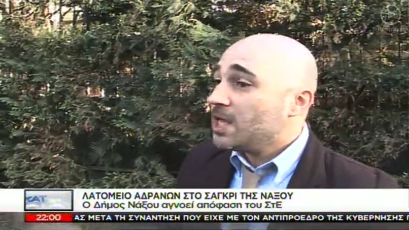 Στο ρεπορτάζ παρουσιάστηκε η απόφαση του Συμβουλίου της Επικρατείας που διατάσσει κλείσιμο του λατομείου ενώ, όπως λέει "ο επιχειρηματίας επιχειρεί να εξασφαλίσει την αδειοδότηση βρίσκοντας σύμμαχο και το δήμαρχο Νάξου που γνωμοδότησε θετικά". Το ρεπορτάζ επίσης κάνει λόγο για κείμενο καταγγελίας το οποίο υπέγραψαν και οι 500 κάτοικοι του Σαγκρίου, ζητώντας την οριστική απομάκρυνση του σπαστηροτριβείου. Σε καταγγελία για το παραπάνω θέμα έχει προχωρήσει και ο Ναξιώτης δημοσιογράφος Κωσταντίνος Μπογδάνος.