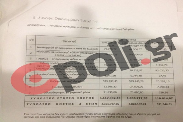 Σύμφωνα με έγγραφο (ακολουθεί), που διανεμήθηκε στους δημοτικούς συμβούλους, το ετήσιο κόστος ανάθεσης υπηρεσιών Καθαριότητας σε ιδιώτη ανέρχεται σε 1.006.717,58 €, με το κόστος τριετίας να ανέρχεται σε 3.020.152,74 €, με τη Δημοτική Αρχή να κάνει λόγο για “φθηνότερες” υπηρεσίες, αφού τα αντίστοιχα κόστη εκτέλεσης από τον Δήμο υπολογίζονται σε 1.117.332,45 και 3.351.997,35 €, αντίστοιχα, με τα παρόντα μέλη της Ομοσπονδίας να τα αμφισβητούν.